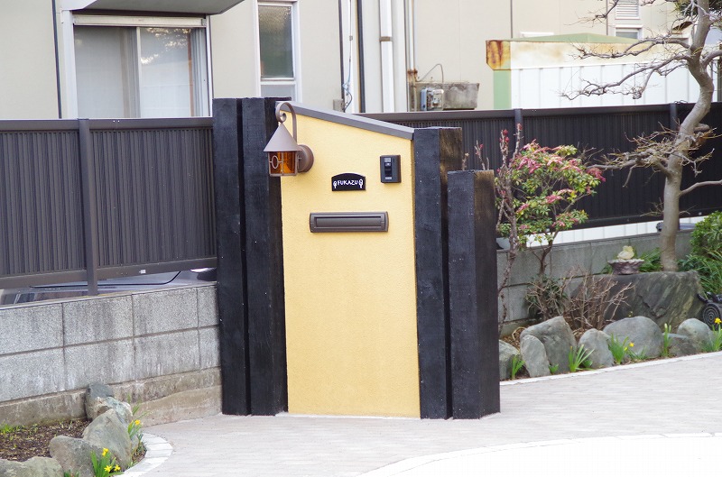 枕木とジョリパット塗装の門柱がとても気に入りました