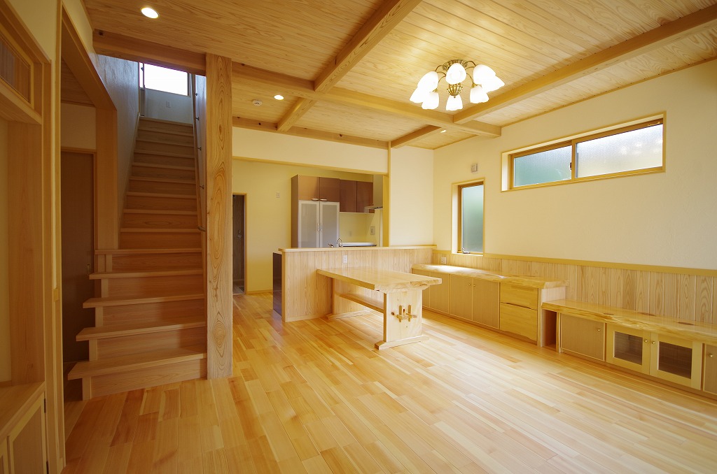 LDK(とにかく木が好きなのと語る奥様、家具、テーブルも桧の手造りです)