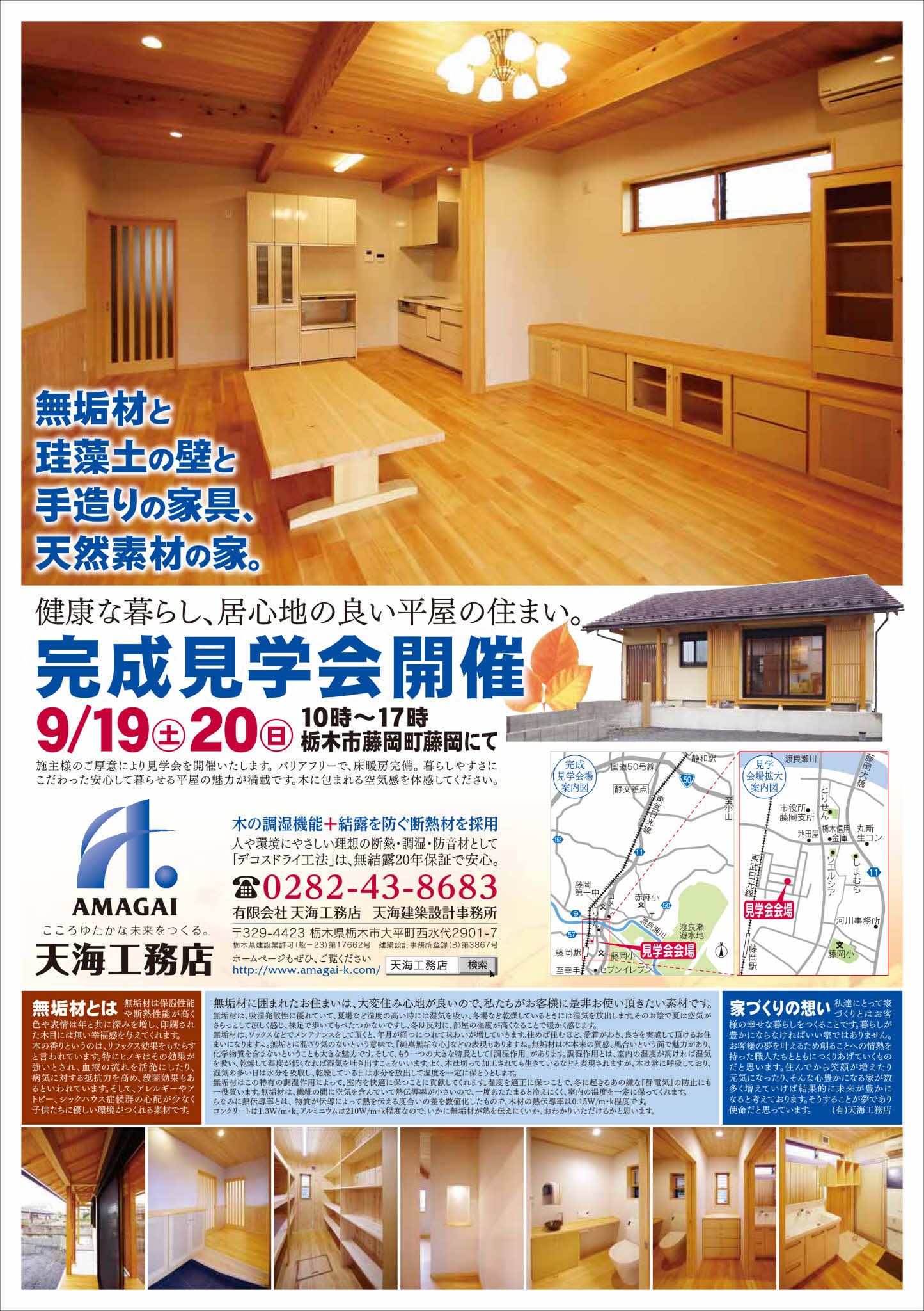 施主様のご厚意により藤岡町藤岡(藤岡駅北住宅地内)にて見学会を開催いたします 開催日時 9月19日(土)・20日(日) AM10:00~PM5:00 木と自然素材の平屋の家 全て手造りの家具 爽やかな空気の違いをこの機会に体感してください