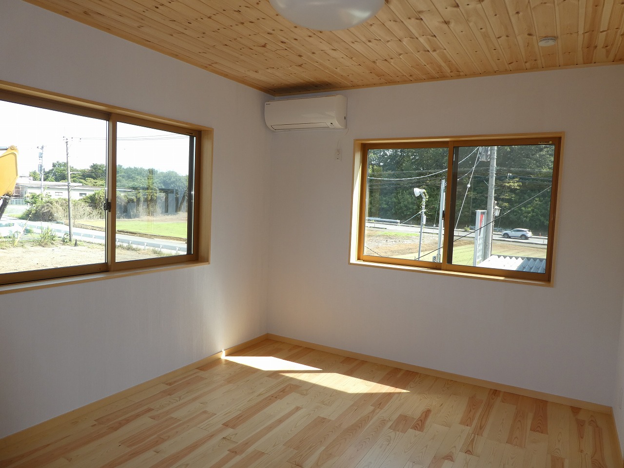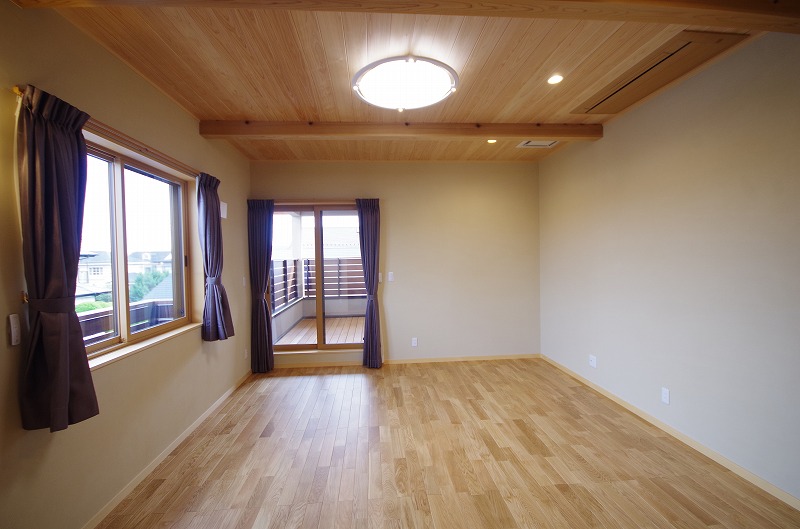 寝室の天井は構造材の梁を鉋仕上げであらわし
