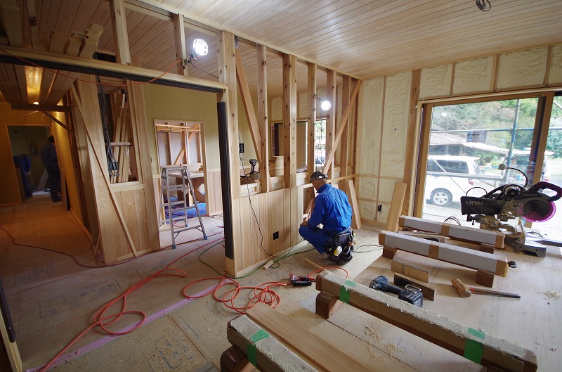 床も無垢板のフローリングを施工して