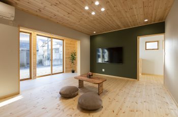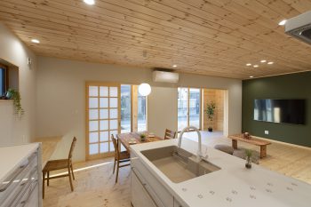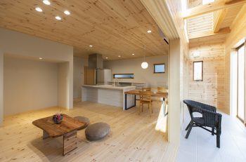 LDK:建具を開放すると南面の吹き抜けの内部テラスにより