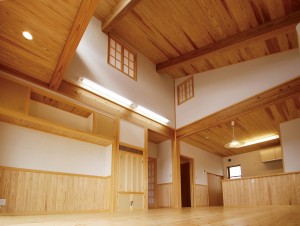 内装材はすべて自然素材、天井は無垢の杉板張り、床は無垢のサクラ