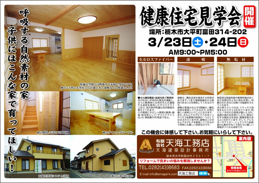昨今では安かろう悪かろうのビニール建材や合板などの建材が多い中、極力呼吸する素材(透湿性能が高い)を使用した住む人や、建物が健康で安心な建築を提供し続けたいと思います