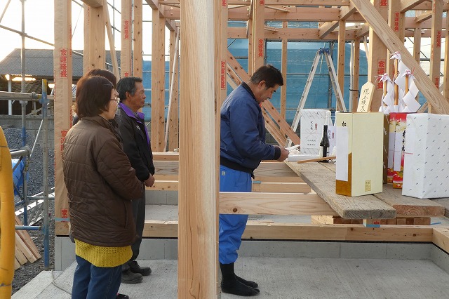 「上棟式」は建前(タテマエ)建舞とも呼びます。工事に関わった人が一同に会し、今後の工事の安全を祈願し、お互いの協力の元に家をつくり上げていこうとする意思表示の会でもあります。
